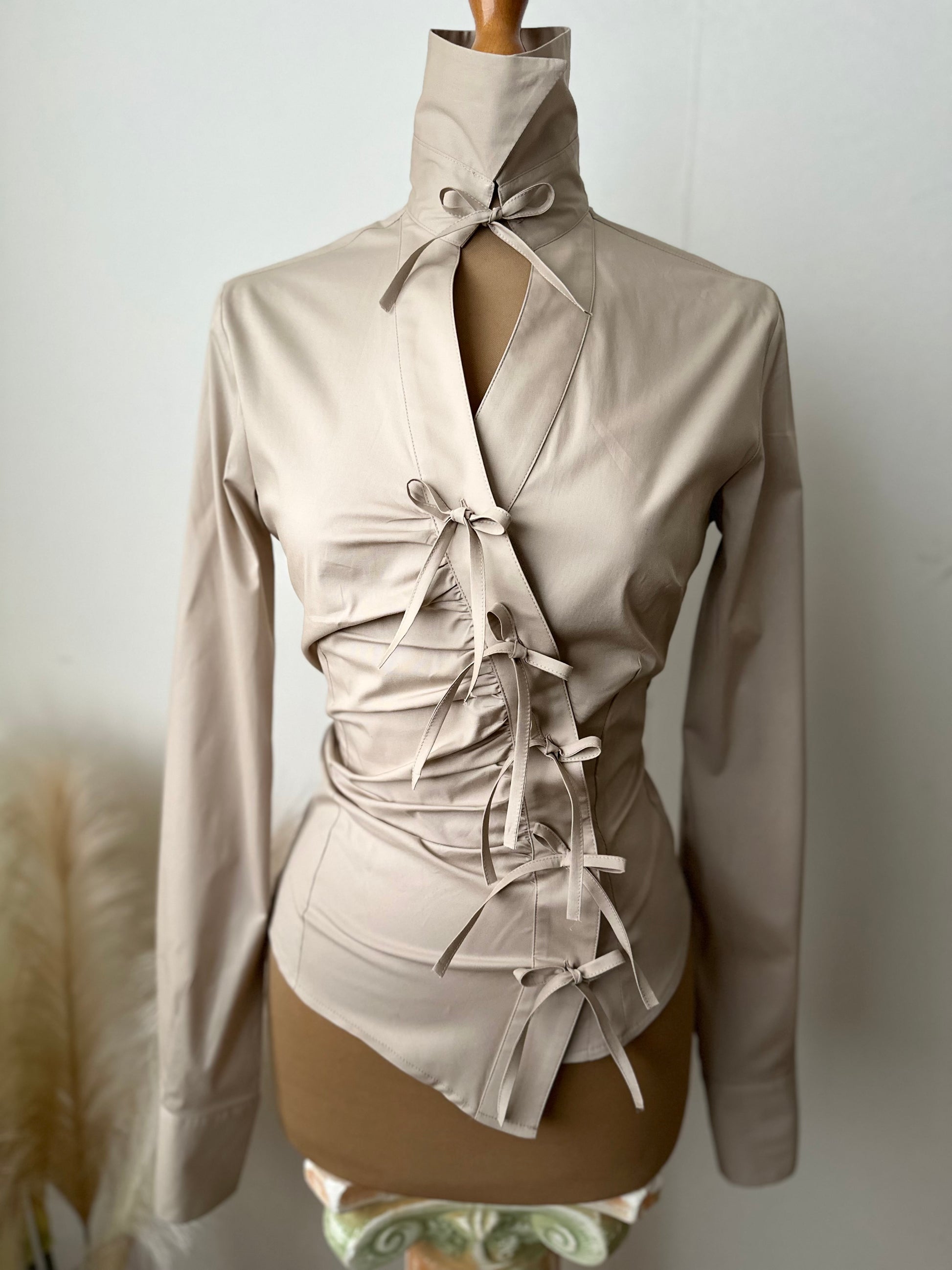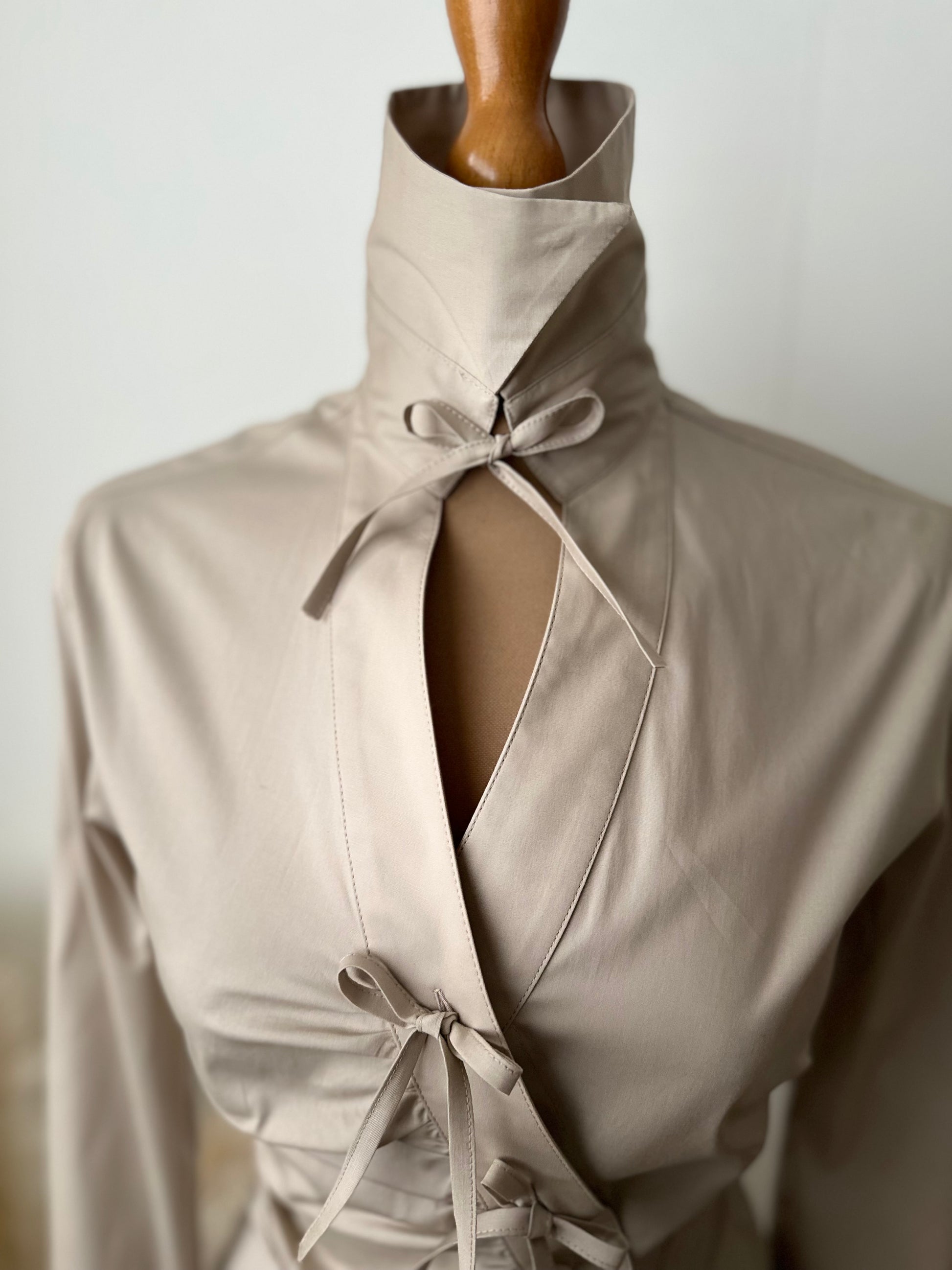 Camicia beige con fiocchi (fencingstyle) capo in cotone leggermente elasticizzato con maxi colletto a dolcevita.