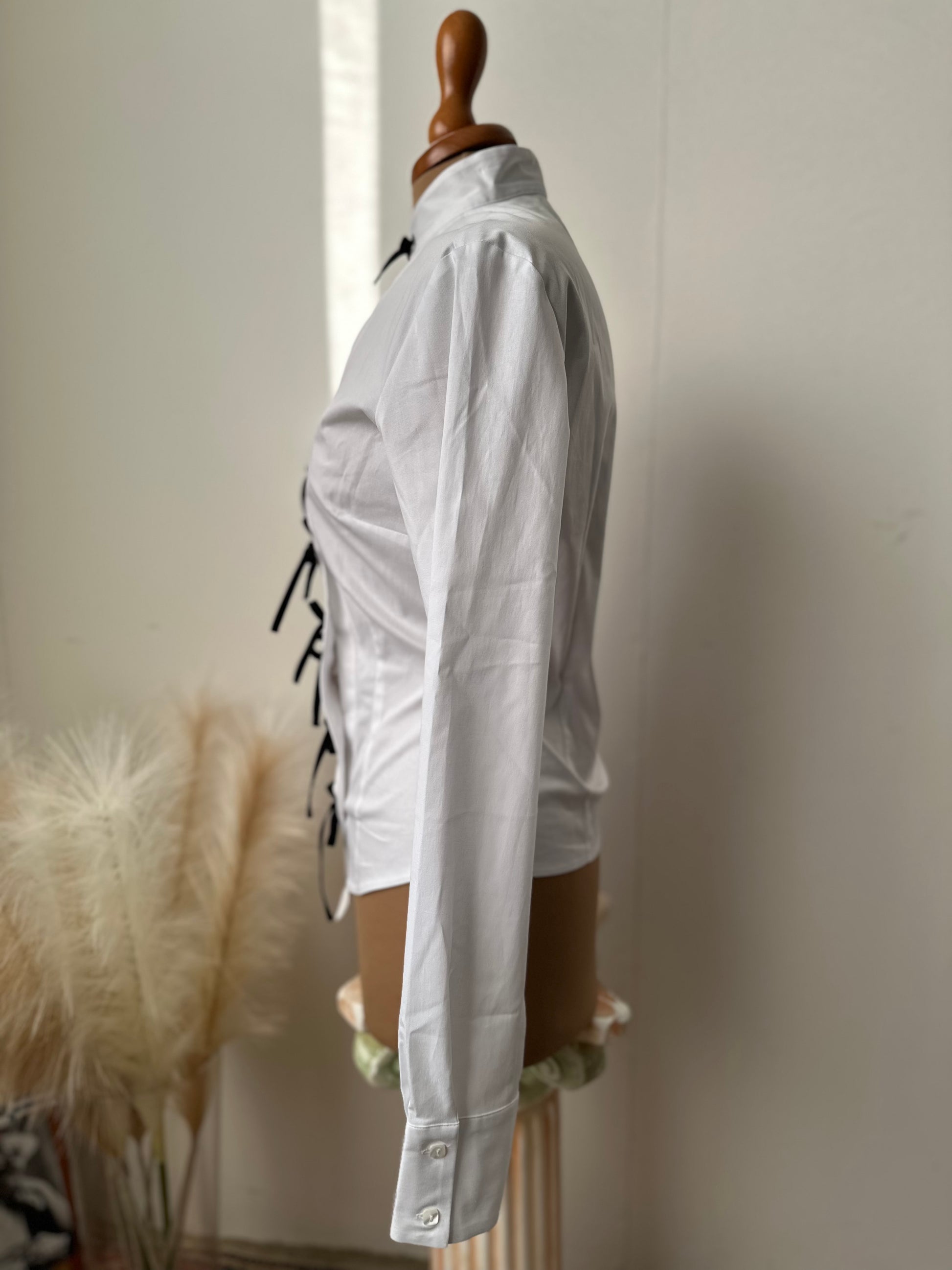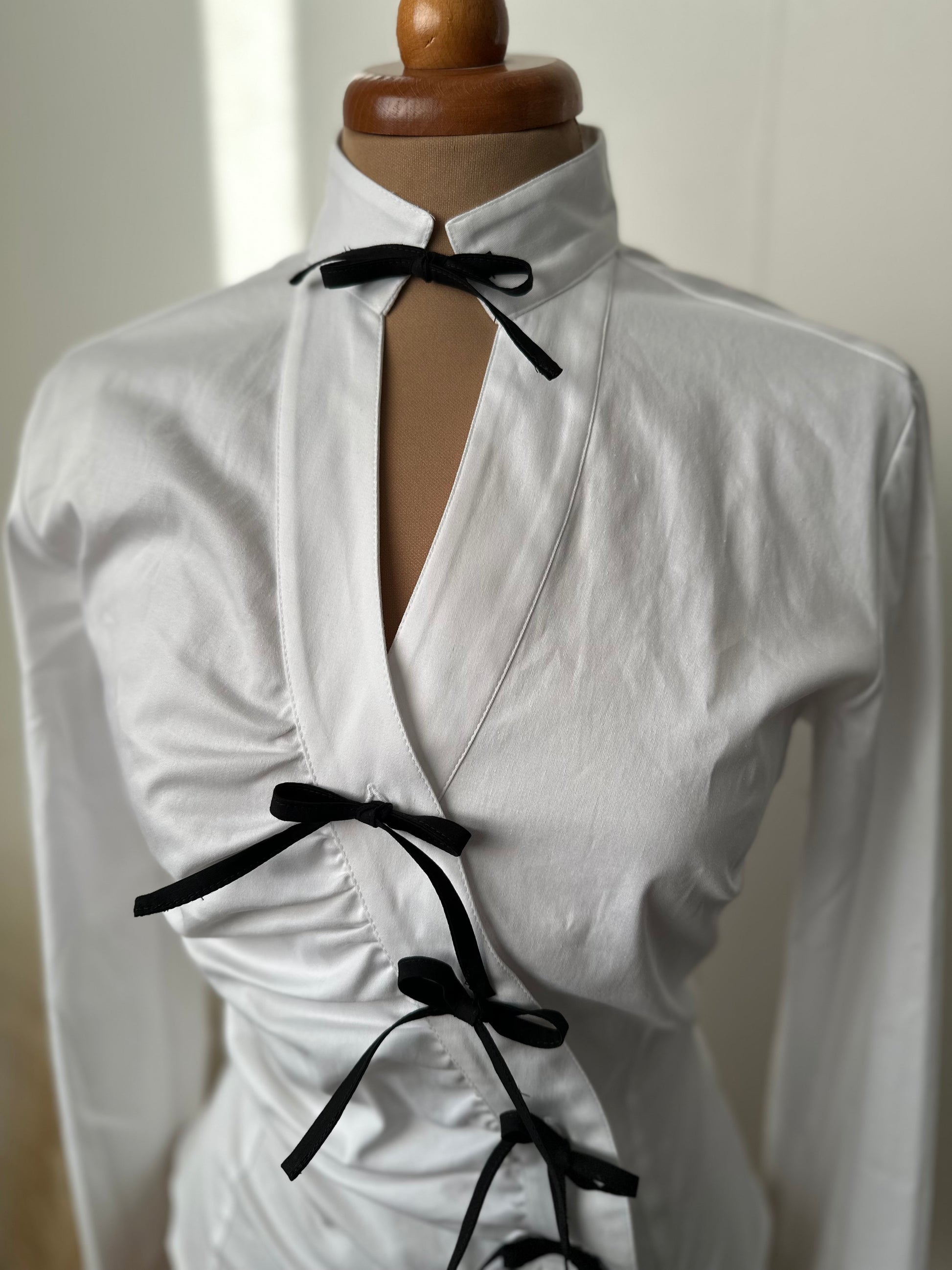 Camicia fiocchetto b/w (Venom) femminile e contemporanea, realizzata in cotone elasticizzato per offrire comfort e una vestibilità che segue la silhouette con naturalezza. Il design è esaltato dalla chiusura frontale con lacci tono su tono, che crea un raffinato effetto arricciato e permette di regolare il fit in base al look desiderato.