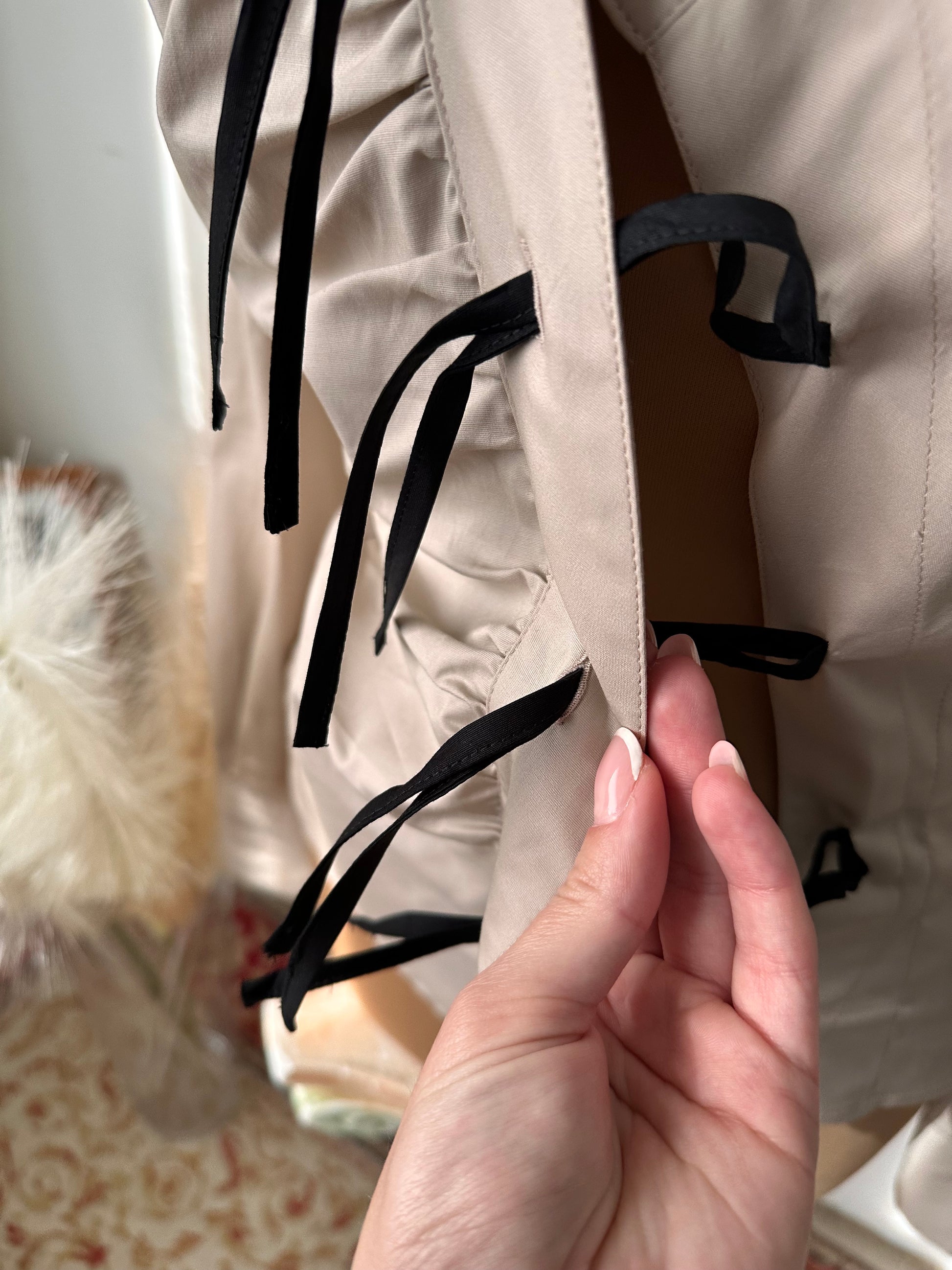 Camicia nude con fiocchi neri a contrasto, ottima vestibilità resta aderente in vita grazie alla sua struttura asimmetrica.